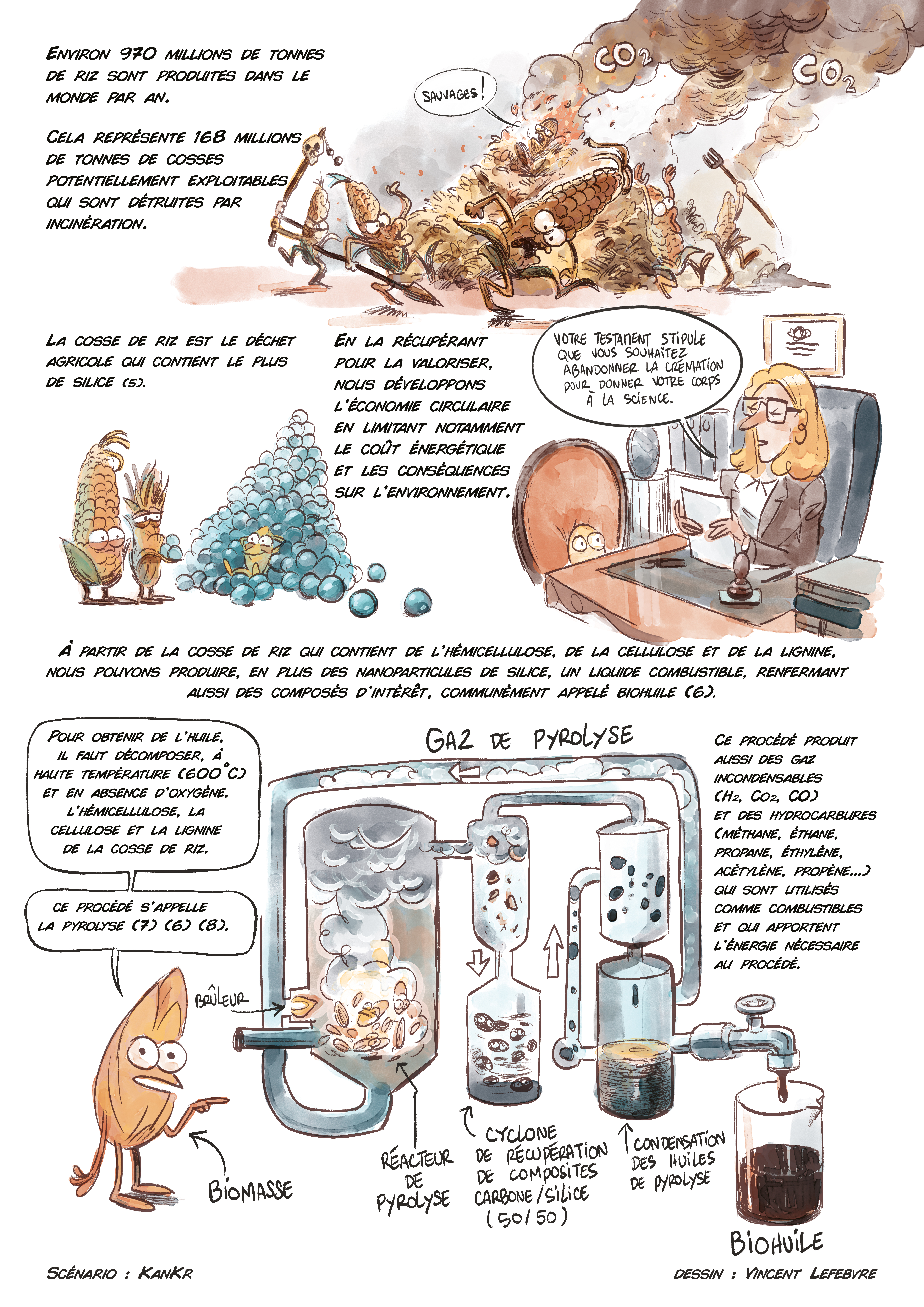 Parmi les plus gros déchets générés par l’agriculture figurent ceux provenant des plants de riz, en particulier des cosses qui entourent les grains, appelées balles de riz. Ces dernières sont le principal sous-produit, ou résidu, de l’industrie de la minoterie du riz. La production mondiale de cette céréale est estimée à près d’un milliard de tonnes par an, générant lors de l’étape de mouture, 170 millions de tonnes par an de balle de riz [4]. Cependant, la teneur en protéines de cette biomasse résiduelle abondante n’étant pas suffisante pour les usages agricoles, comme nourriture ordinaire pour le bétail, et leur forte composition en matière inorganique ne les rendant pas facilement décomposables par les bactéries, la plupart de ces résidus finissent brûlés ou enfouis [13].