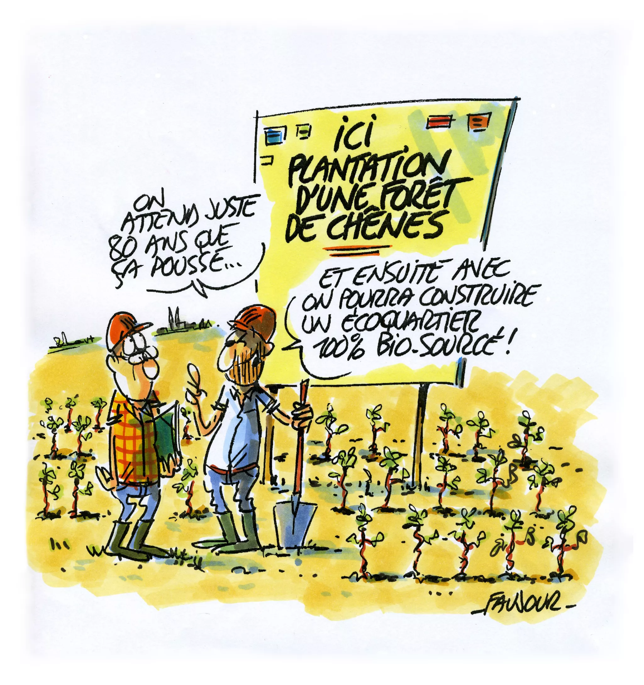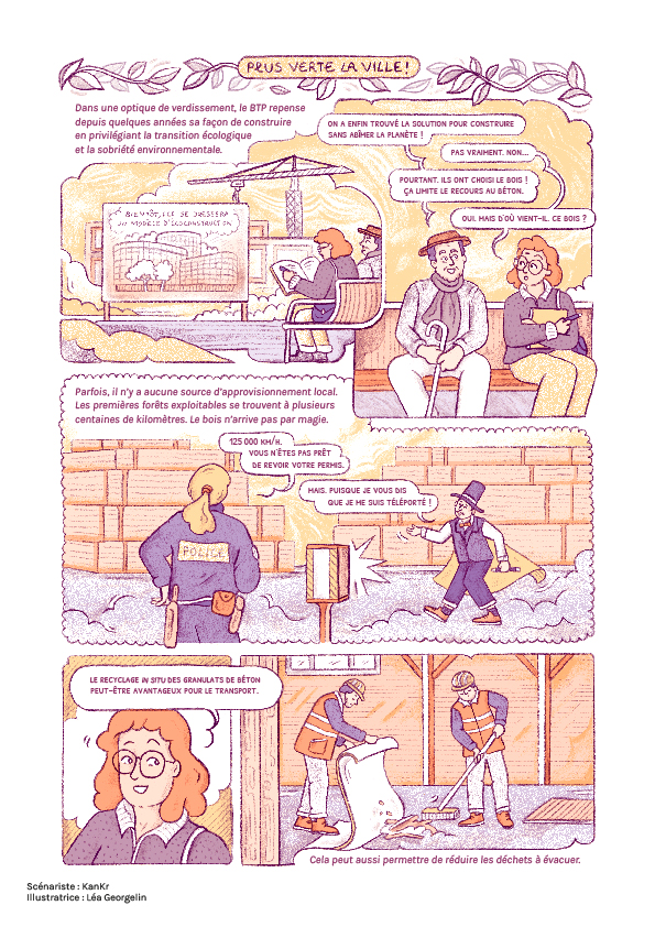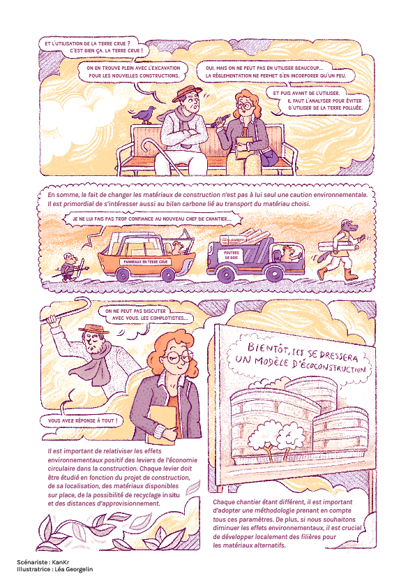 Le recours à de nouveaux matériaux a également été mis œuvre, avec une utilisation de la terre crue ou au bois. Ce changement de matériaux implique aussi la modification des quantités de béton nécessaires, celle des tonnages transportés et des zones d'approvisionnement... à considérer pour ces nouveaux matériaux et notamment pour le bois.