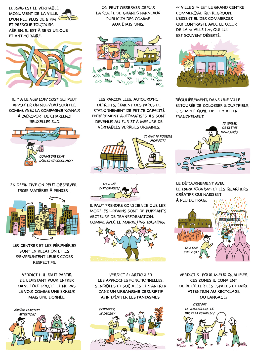 Comme d’autres villes belges, celle-ci est équipée d’un ring. Mais il est ici presque toujours aérien (sinon en tunnel), d’un peu plus de cinq kilomètres. C’est le véritable monument de la ville. À sens unique, anti-horaire, son expérience fait songer à la grande époque autoroutière. Cette boucle a véritablement ceinturé la ville héritée. Depuis cette route, on observe de grands panneaux publicitaires comme aux États-Unis. Une productrice de cinéma, conviée dans la presse institutionnelle, dit à son propos que « du haut, on a l’impression d’être dans une grande ville ». À l’intérieur donc, une ancienne ville riche, désormais assez déprimée mais que l’on cherche à nouveau à remplir et animer. Si « ville 2 », le grand centre commercial qui concentre désormais l’essentiel des commerces, est connue de tous, il tend à définir, en creux, une « ville 1 », dont la place centrale voit ses jets d’eau régulièrement tomber en panne. D’autres monuments-phares de la ville-centre sont aujourd’hui désertés. Le plus massif, de tous côtés qu’on l’aborde, est le centre des expositions de Charleroi.