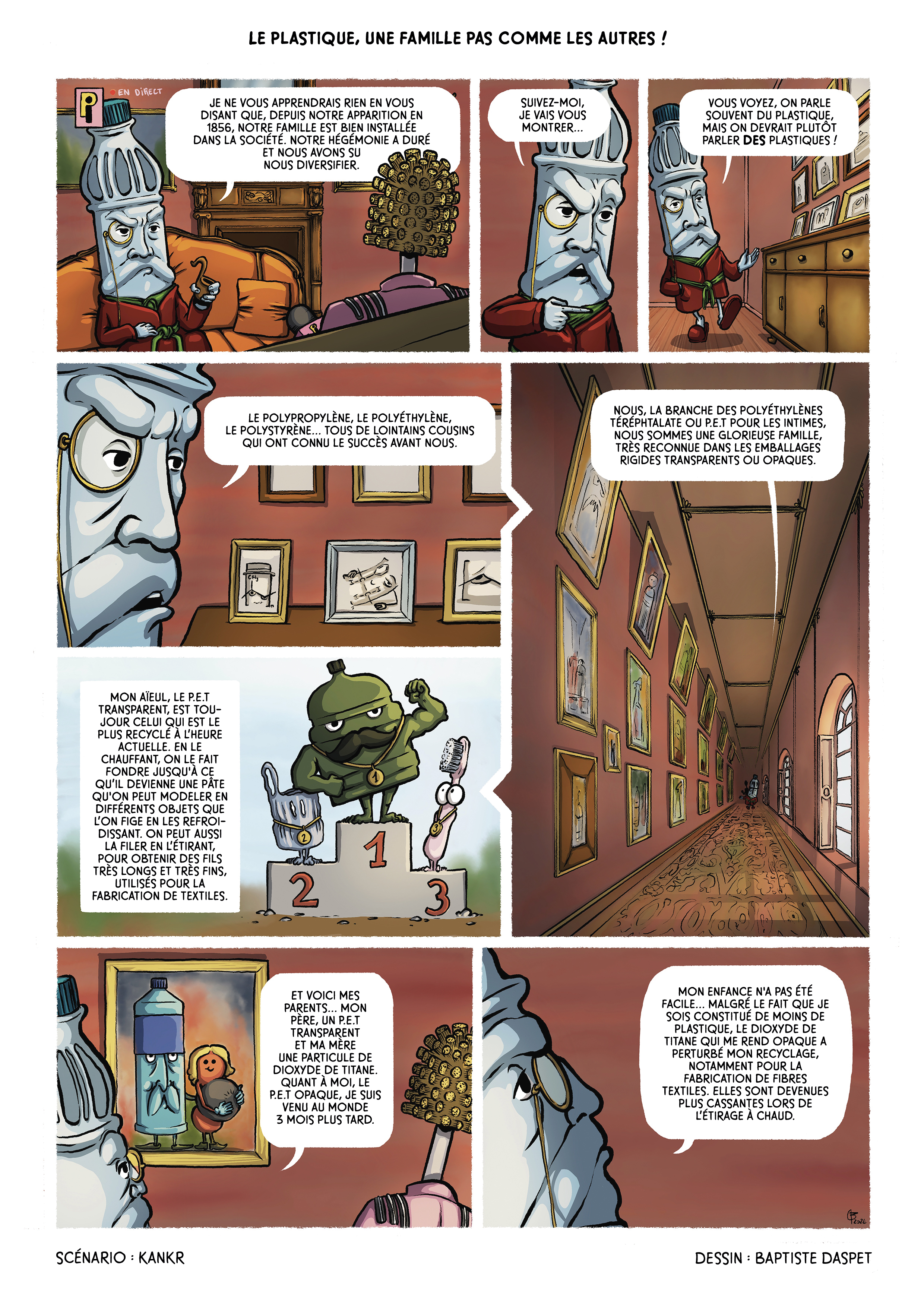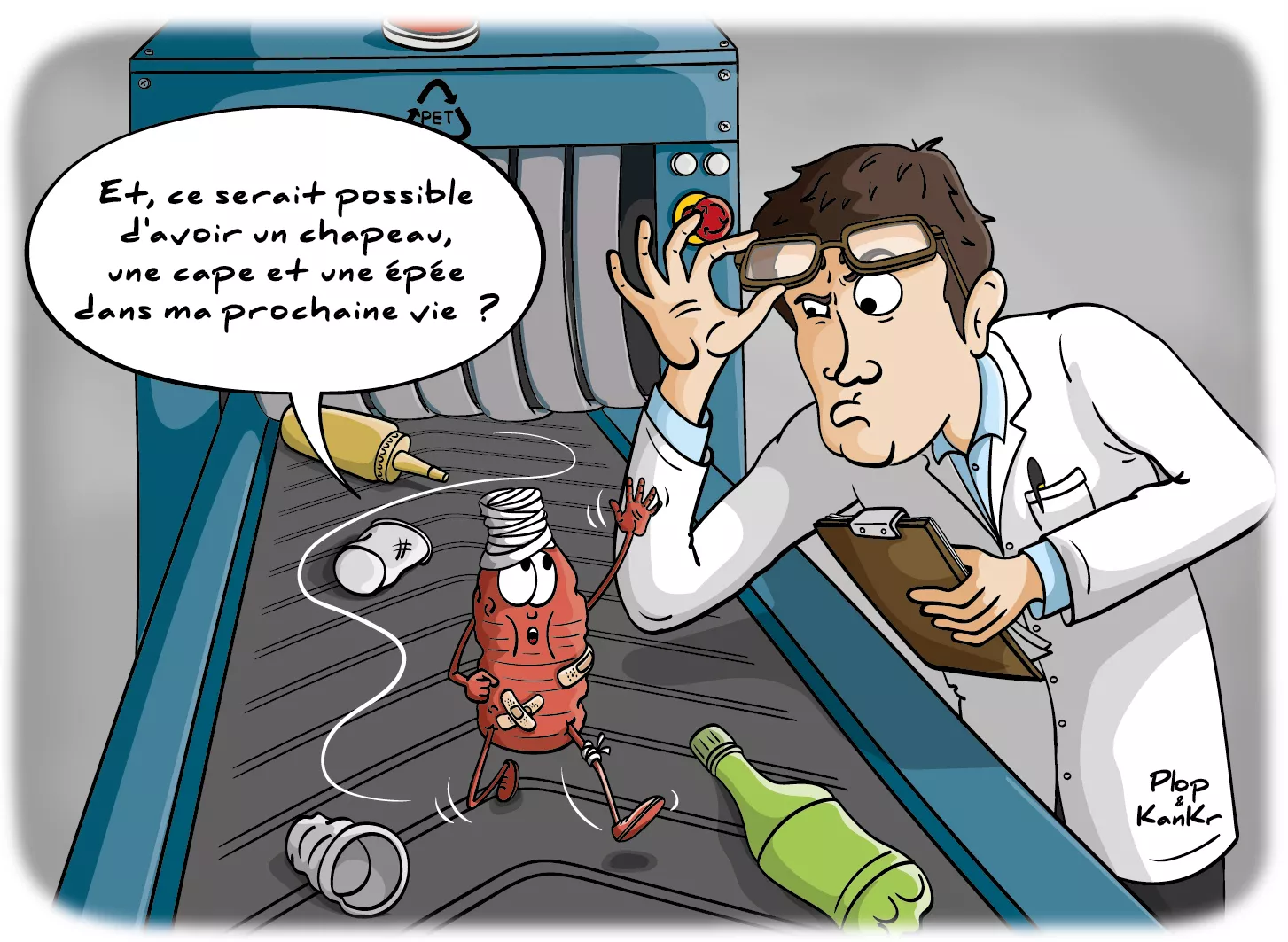 Différents plastiques sont présents dans notre quotidien. On compte parmi les plus courants le polystyrène, le polypropylène, ou le polyéthylène . Celui qui nous intéresse ici est le polyéthylène téréphtalate, dit également PET. Le PET sert notamment à fabriquer des emballages rigides, sous deux formes : transparente comme pour les bouteilles d’eau et de boissons gazeuses ou encore les barquettes, ou alors opaque comme on le retrouve pour certaines bouteilles de lait, de jus de fruit et bien d’autres [1].