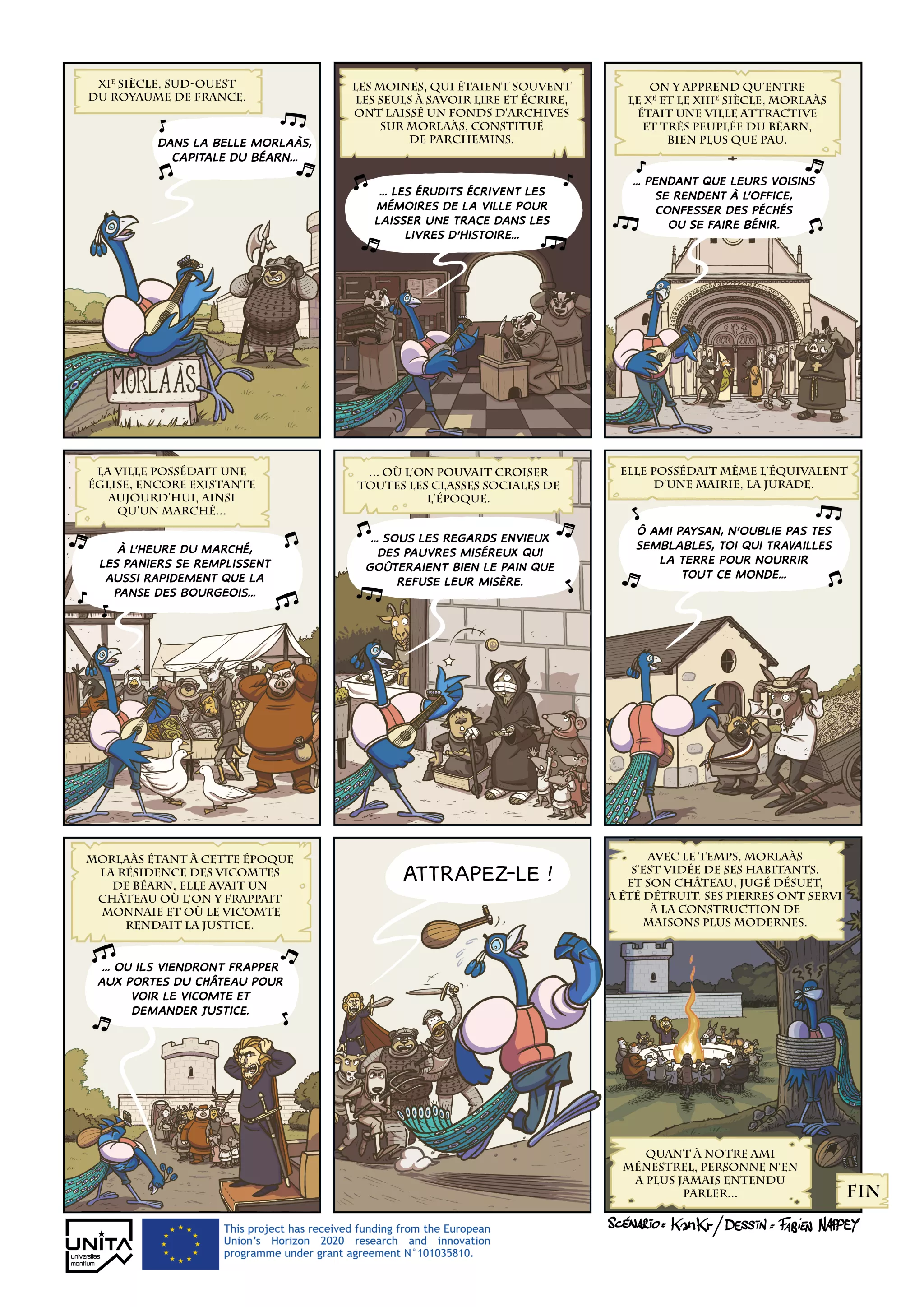 Guidés par leur enseignant, Olivier Meunier et Pierre Courroux, les élèves de niveau CM1 et CM2 ont assimilé les aspects quotidiens de la vie à Morlaàs, fondés sur des recherches académiques poursuivies au sein du laboratoire ITEM de l’UPPA. Avec l’aide du dessinateur et du scénariste, ils ont ensuite conçu un scénario et des personnages, explorant la symbolique des animaux et des couleurs. L’atelier final de dessin a donné vie à ces idées, formant une planche de BD, que vous pouvez lire ci-dessus, et à deux planches de BD réalisées par Fabien Nappey, que vous pouvez lire dans les pages suivantes.