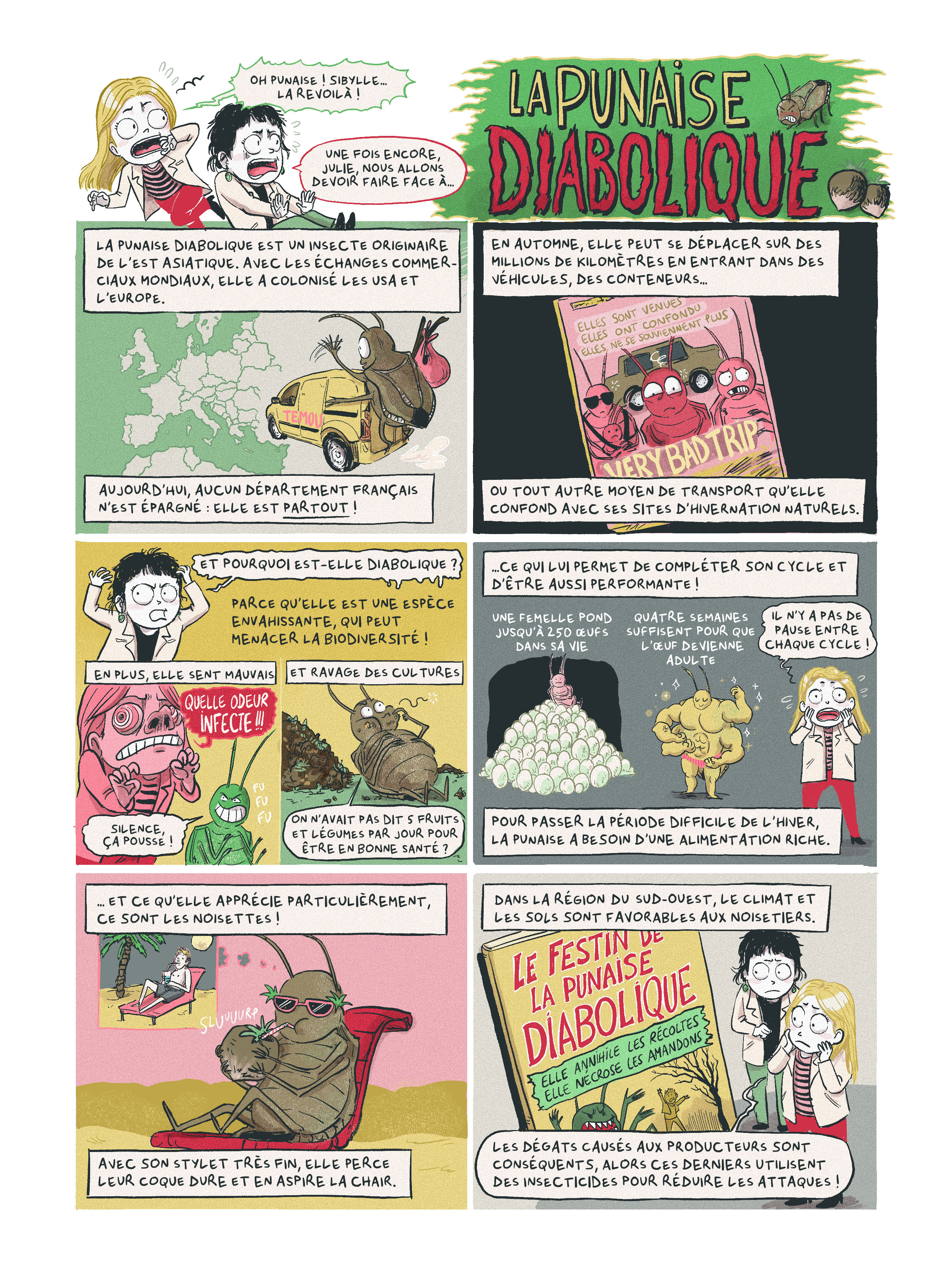 C’est à Fraval (2011) que l’on doit ce nom évocateur de « punaise diabolique », et il faut bien reconnaitre qu’il n’avait pas tort [1]. D’un point de vue écologique, Halyomorpha halys est une espèce exotique envahissante, capable de perturber les équilibres locaux et de menacer la biodiversité. Dans les habitations, c’est une véritable casse-pied : à l’automne, elle cherche un endroit douillet pour passer l’hiver… quitte à s’inviter dans nos cuisines, se glisser entre les casseroles ou sous le linge qui sèche. Et si on a le malheur de la déranger, elle dégage une odeur âcre et persistante que bien des nez connaissent désormais. Du côté des cultures, elle n’est pas en reste : sa capacité à se nourrir de plus de 300 plantes en fait un ravageur redouté aussi bien en arboriculture, qu’en grandes cultures ou en maraichage [3]. Autrement dit, de par son aspect nuisible et envahissant elle est diabolique pour à peu près tout le monde, et c’est encore sans compter les difficultés à réguler sa population.