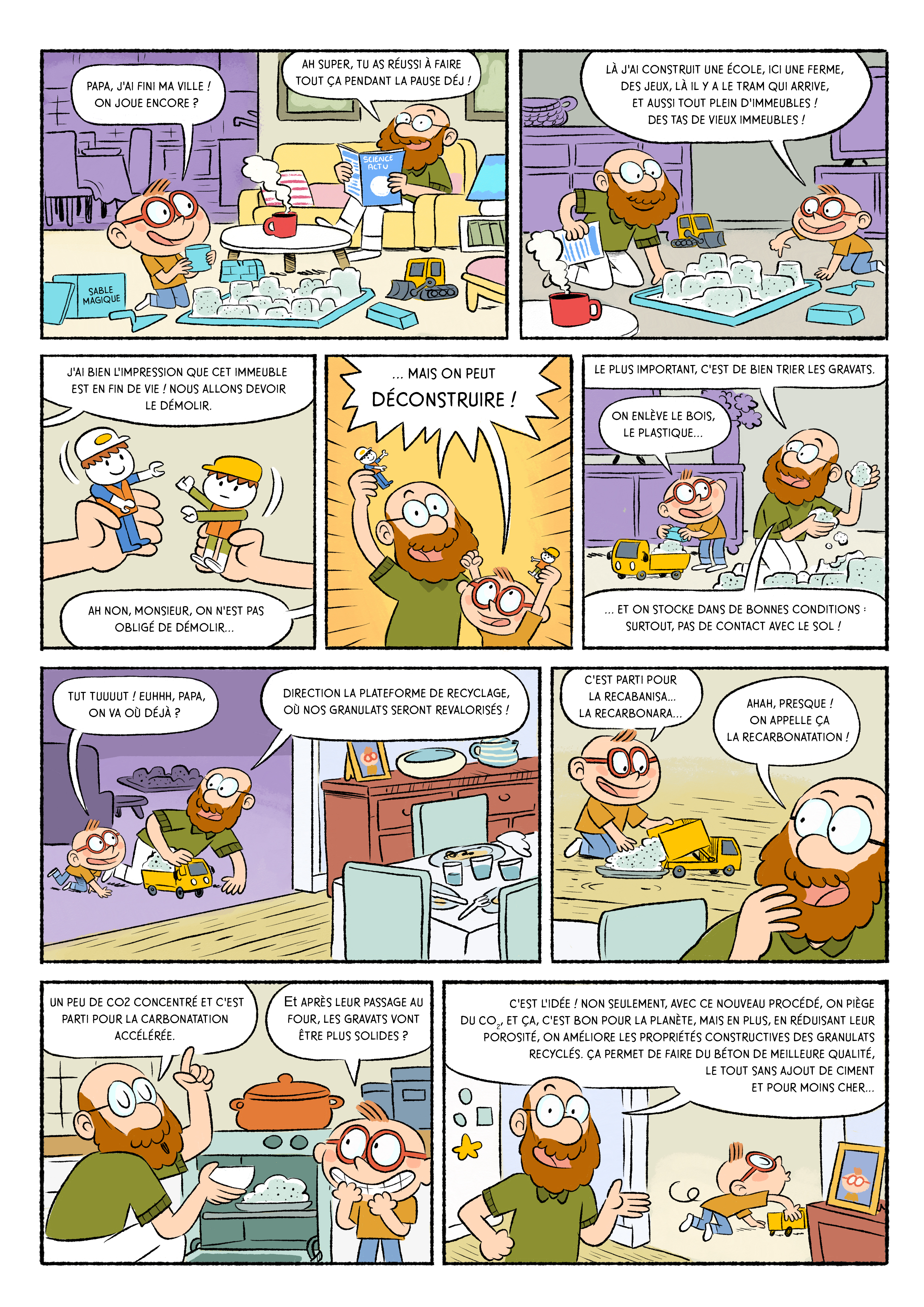 Ainsi, ce processus envisagé, dit de « recarbonatation des granulats de démolition », constitue une voie de valorisation qui présente un double avantage environnemental : le piégeage du CO2 d’une part et l’amélioration des propriétés constructives de ces granulats d’autre part. Cela permet de refaire des bétons de meilleure qualité sans rajout de ciment par rapport à un béton de granulats naturels, et ainsi, l’impact CO2 du béton peut être réduit jusqu’à 10 %, par l’utilisation de sables et gravillons recyclés et recarbonatés [1].