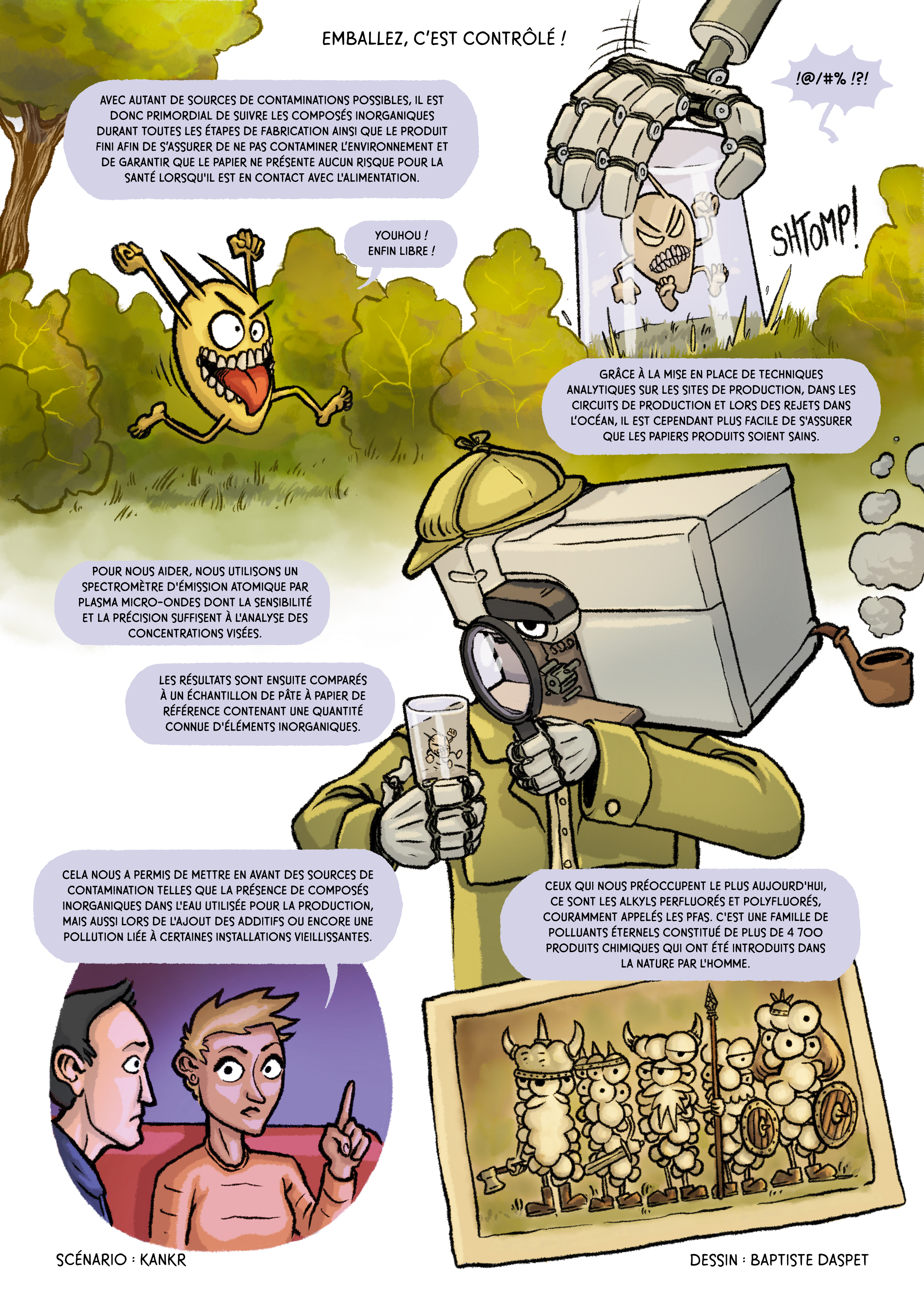 Ces travaux ont confirmé l’importance d’effectuer un suivi plus fréquent des composés inorganiques dont les sources de contamination vont continuer à croître, principalement avec l’augmentation de l’utilisation de matières premières recyclées. Les méthodes analytiques développées, notamment pour le papier, vont prochainement être mises en place sur site industriel pour permettre un monitoring plus fréquent. Pour l’étude du procédé de fabrication, les travaux sur la méthode d’analyse vont être poursuivis afin de la rendre possible par MP-AES. Mais désormais c’est le cas de la contamination au fluor, au cœur des actualités ces dernières années pour son omniprésence autour de nous et pour son impact sur la santé, qui intéresse la recherche.