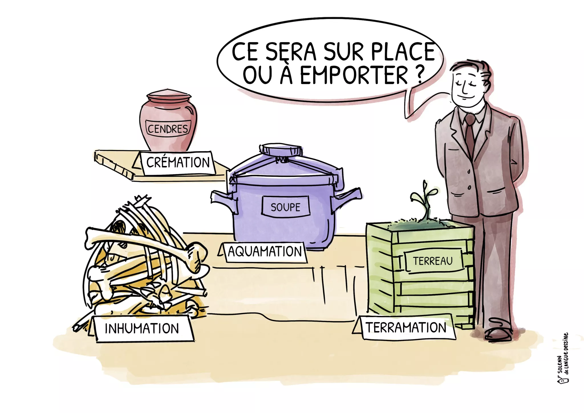 Subsiste enfin une question éthique, celle de la dignité du corps. Les pratiques existantes sont considérées comme respectueuses car communément acceptées. Certaines ont pour but, ou tout du moins pour conséquence, de retarder la décomposition du corps en l’isolant (enterrement). On peut même opter pour des « soins de conservation », très courants en France : ils consistent à percer les organes avec une immense canule pour remplacer le sang par une solution de formol. On le voit : retarder et cacher l’inévitable décomposition des corps morts est louable pour les proches, mais questionnable du point de vue du défunt. Une autre vision, celle offerte par la crémation ou l’aquamation, propose au contraire de faire disparaitre le corps très rapidement, presque instantanément. Là encore, il s’agit d’une utopie : à y réfléchir dans les détails, ces solutions n’apparaissent pas nécessairement plus respectueuses du corps mort.