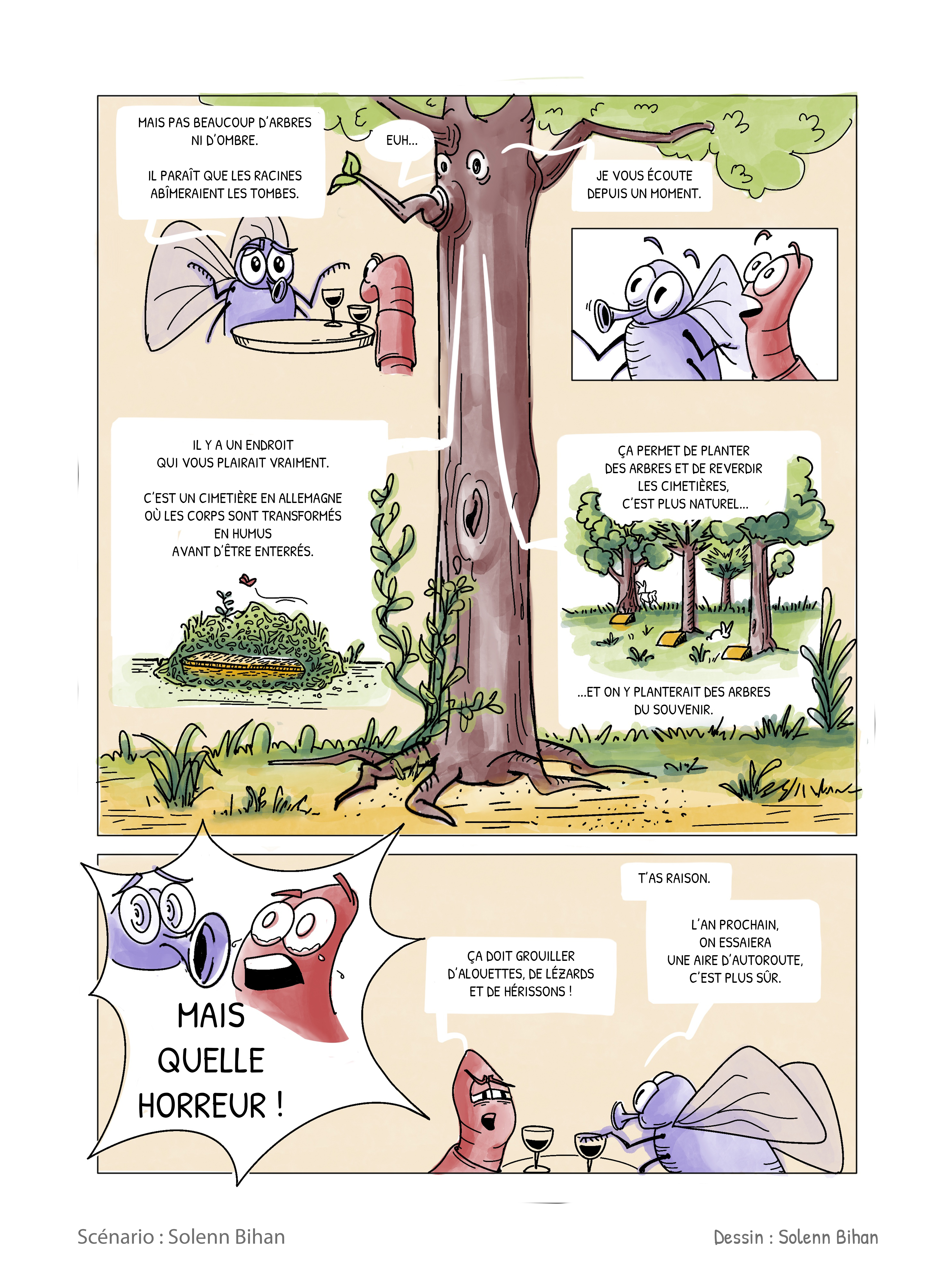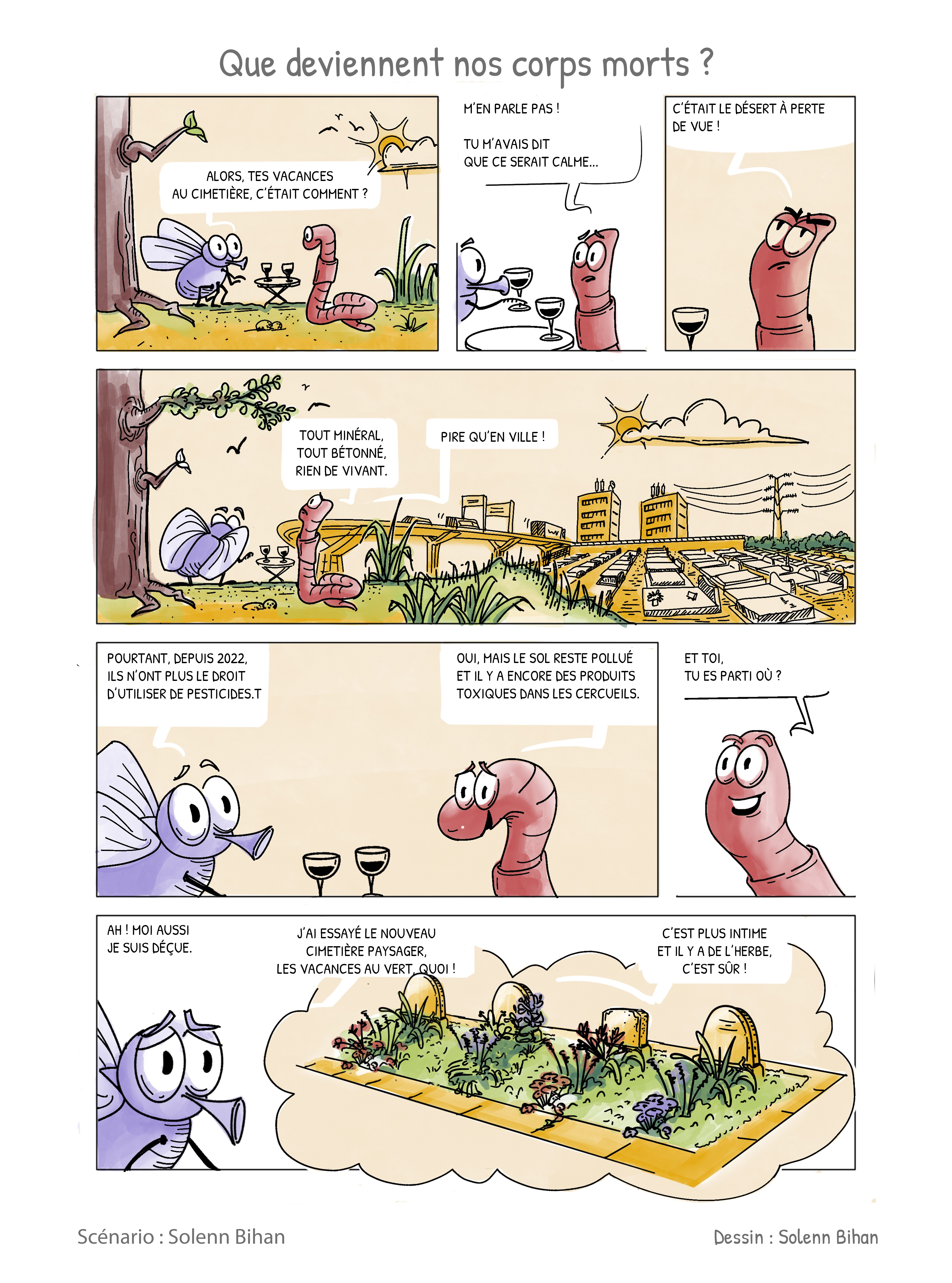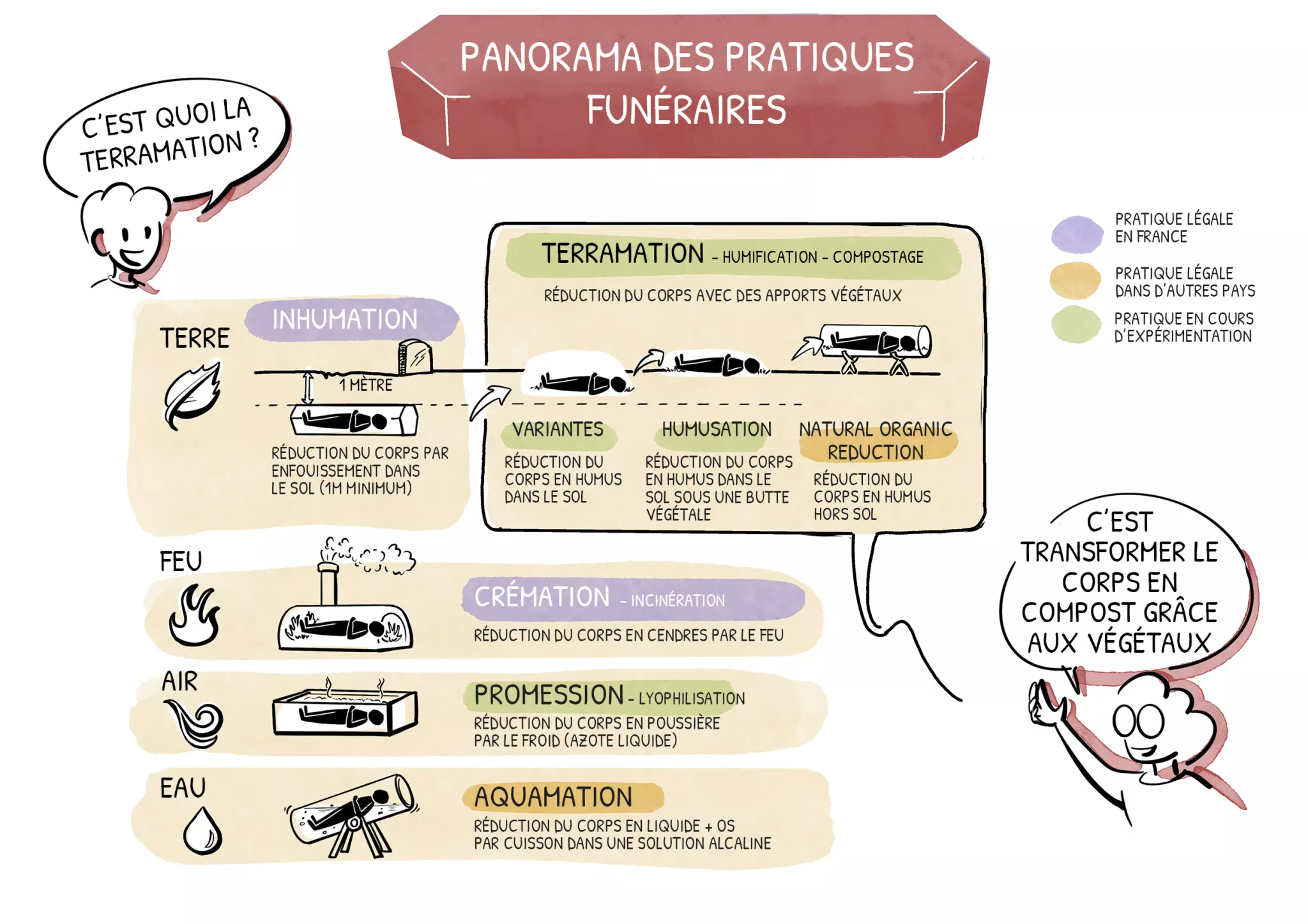 Une autre option est celle de la terramation, l’enterrement végétal. Voulue comme un retour à la nature, cette pratique consiste à favoriser la biodégradation du cadavre en apportant du carbone végétal. Des microorganismes aérobies peuvent alors rapidement transformer le tout en compost destiné à reverdir les cimetières. Cette idée, en plein essor aux USA, est également à l’étude en Europe : plusieurs projets de recherche ont débuté afin de tester la faisabilité technique de cette nouvelle voie funéraire. Car derrière le récit voulant replacer l’Homme dans le cycle du vivant, le compostage des corps suscite des questions opérationnelles (faisabilité technique) et sanitaires.