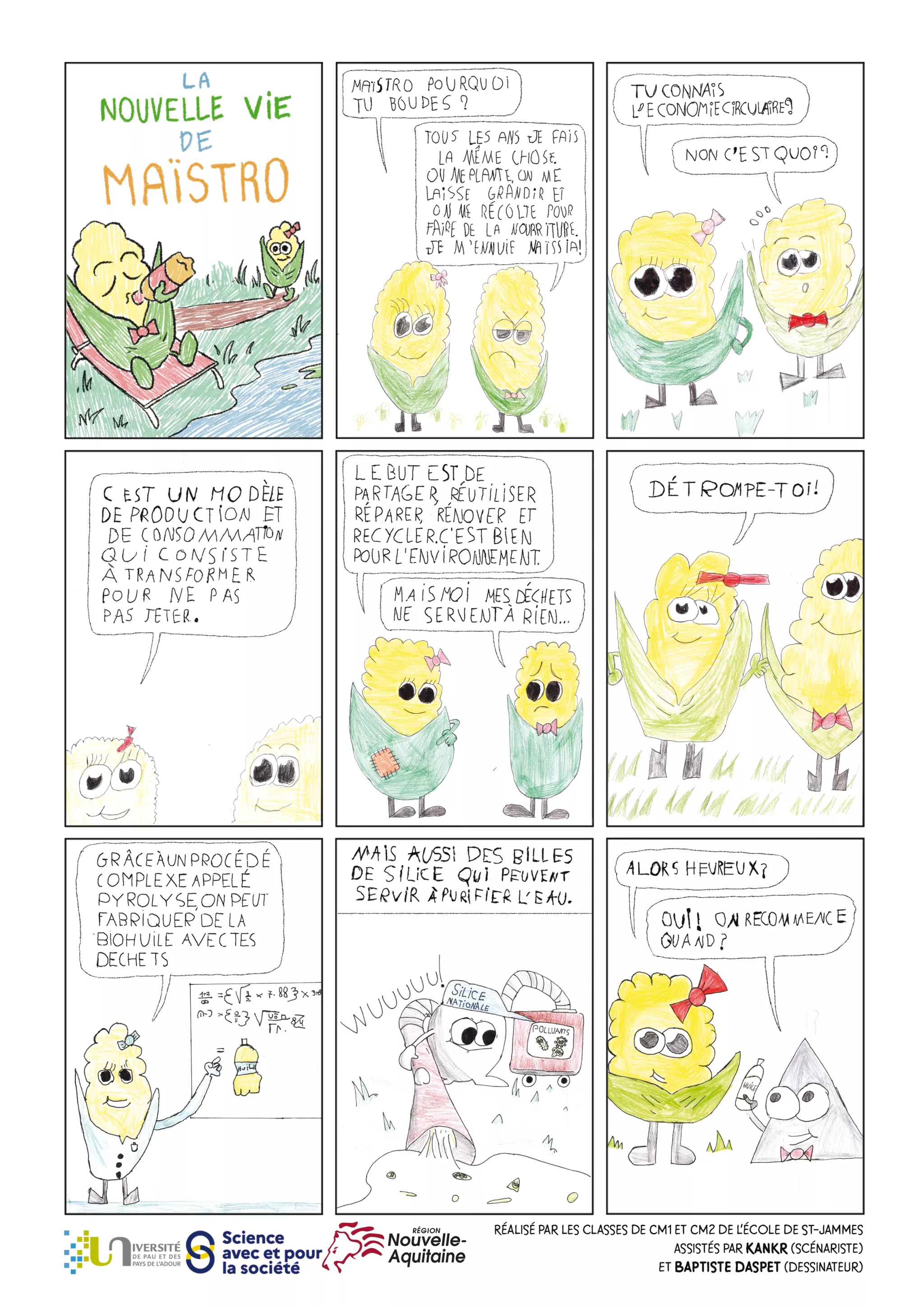 Lors de cette édition, le chercheur Brice Bouyssière a présenté aux élèves de CM1 et CM2 de l'école de Saint-Jammes, ses travaux de recherche sur le maïs, accompagné des artistes Baptiste Daspet (dessinateur), KanKr (scénariste).