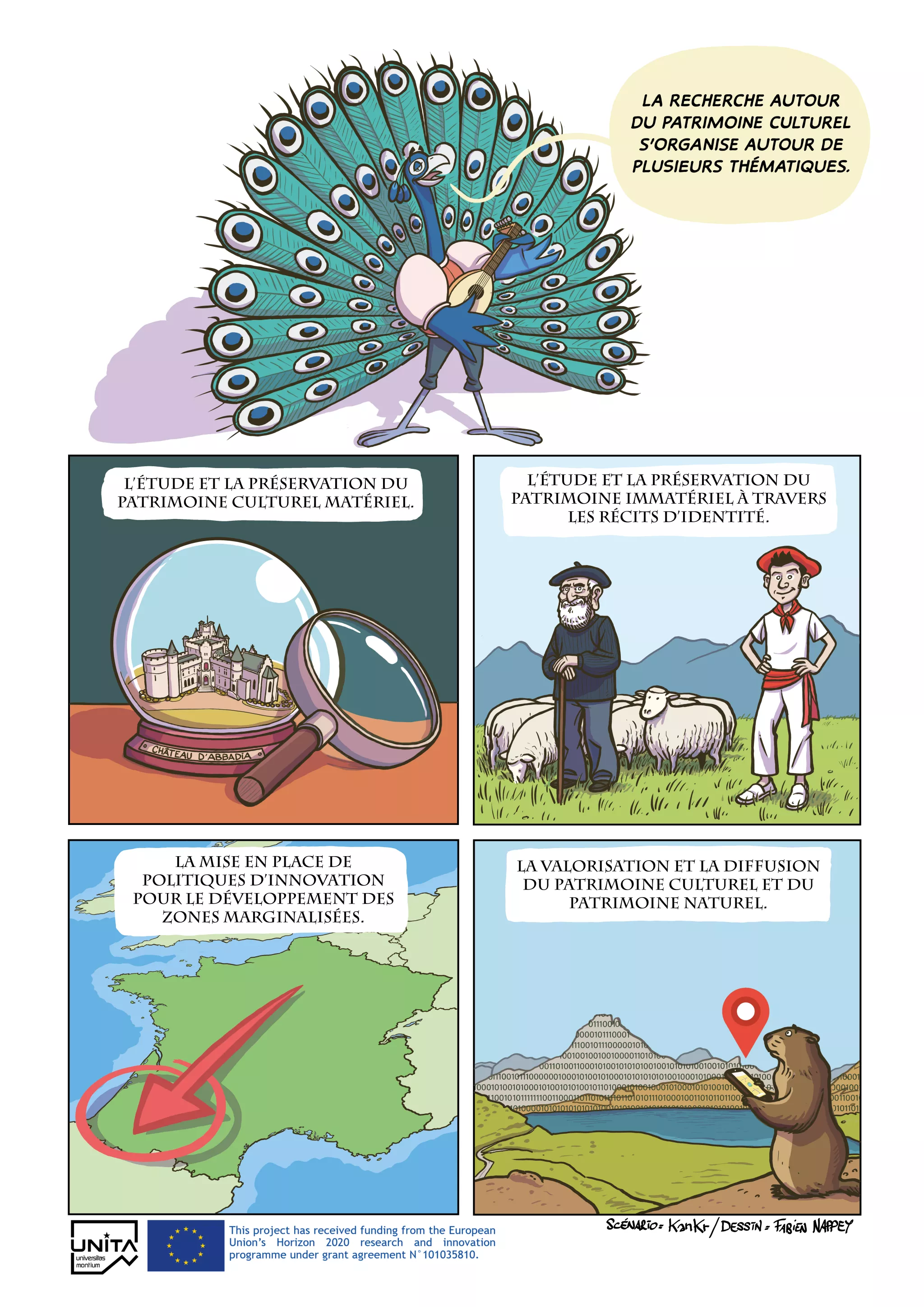 Guidés par leur enseignant, Olivier Meunier et Pierre Courroux, les élèves de niveau CM1 et CM2 ont assimilé les aspects quotidiens de la vie à Morlaàs, fondés sur des recherches académiques poursuivies au sein du laboratoire ITEM de l’UPPA. Avec l’aide du dessinateur et du scénariste, ils ont ensuite conçu un scénario et des personnages, explorant la symbolique des animaux et des couleurs. L’atelier final de dessin a donné vie à ces idées, formant une planche de BD, que vous pouvez lire ci-dessus, et à deux planches de BD réalisées par Fabien Nappey, que vous pouvez lire dans les pages suivantes.